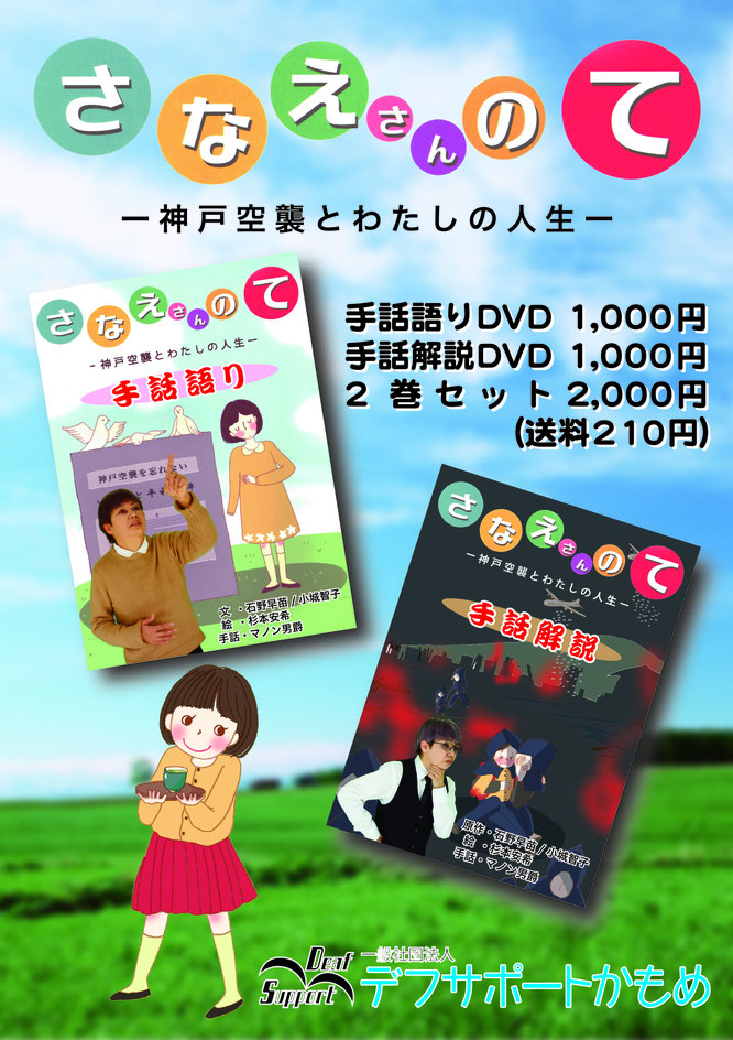 絵本「さなえさんのて」を手話語りで表現しました。また、神戸大空襲の悲劇をよりよく知っていたたげるよう、「さなえさんのて」の時代状況などを手話解説編で説明しています。二冊セットで購入されることをお勧めします。